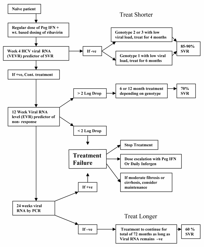 In naïve patients in special populations, the treatment can be started off with regular dose of pegylated interferon and weight based dosing for ribavirin. However, since these populations in general have a lower response rate, it seems reasonable to modify dosage or length of treatment based on 4th and 12th week viral RNA level. Patients with genotype 2 or 3 and genotype 1 with low viral load who became negative for viral RNA at week 4 , may have a shorter length of treatment of 4 months and 6 months respectively without sacrificing the SVR.