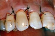A full-thickness flap was elevated and the granulation tissue was removed showing the true extension and depth of the infra-bone defect.