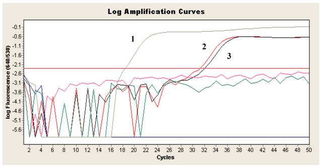 Log amplification curve of Real-time PCR FRET for the detection of T. gondii DNA in aqueous humor showing positive result. 1 = T. gondii DNA positive control; 2, 3 = patient sample (aqueous humor) tested in duplicate.