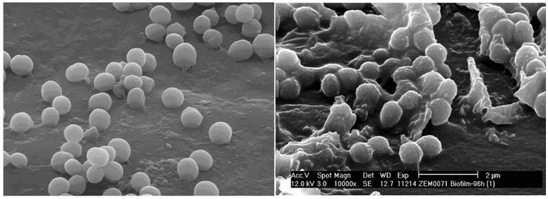 (left) Raster electron microscopy of Staphylococcus aureus from broth culture; (right) Staphylococcus aureus biofilm. Images from S. Sailer und I. Chatterjee, Homburg/Saar.
