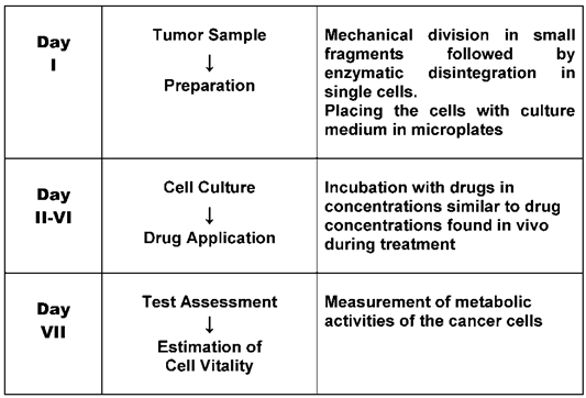 As early as the 1950s, research teams started to develop laboratory tests in order to predict tumor reaction to cytostatic drugs [5]. They used fresh cancer tissue and examined the effect of the drugs on tumor cell growth. At the beginning laboratory techniques were still in their infancy. Short term cell cultures of cancer tissues were difficult to perform and procedures varied from laboratory to laboratory. However, the cancer cell assays were, thanks to better techniques, continuously improved over the last few decades and brought to a certain perfection. There are two steps in the preparation of the tests, first the fresh cell culturing and then, when this is successful the examination of the drug effect. Cell cultures in medicine are now established laboratory tools. Whereas immortalized cancer cell lines used for research purposes have lost a large part of individual tumor characteristics the preparation of fresh tumor tissue is necessary in order to obtain cancer cells with still highly preserved individual tumor properties [6]. Special arrangements have to be made before the biopsy is taken by the oncologist to garantee a rapid and safe transport of the probe i.e. a specialized laboratory must be contacted, the means of transport and transport medium arranged and precaution taken that the probe is immediately placed in the transportmedium. Extensive descriptions of special laboratory techniques for fresh cancer cell cultures are now available [7, 8]. The cell preparation may vary depending on the tumor type in test. Table 1 shows frequently tested tumor types for which special cell preparations were published [9-27]. For the examination of the drug effect after incubation several methods are in use. In the 1970s the method of measuring the thymidine incorporation into cancer cell DNA [28] was developed by one of us (M.V.). It estimates the inhibitory effect on cell growth. This technique as well as some others have found their way into laboratory practice. Fig. 1 is a schematic illustration of the procedure of fresh tumor cell culture assays. Although various assays have been developed, the principal steps, i.e. isolation of cells, incubation of cells with drugs and assessment of cell survival are the same. Usually a range of drug doses is applied in order to find a dose-response relationship. Drug concentrations in the tests are similar to drug concentrations usually found in-vivo during treatment. All methods measure molecular processes of cancer cells, revealing cell activity and thus indicating cell growth or death [29, 30]. Frequently used methods are the thymidine incorporation into cell DNA [31] and the loss of cell ATP [32]. Drug resistance can be recognized by no decrease of thymidine uptake into cell DNA or no decrease of cell ATP. Fresh tumor cell culture assays are applicable to many types of cancer, since they register the integral cell reaction. The predictive value of the assays, depending on cancer tissue, which is usually only available before treatment, consists in indicating intrinsic resistance.