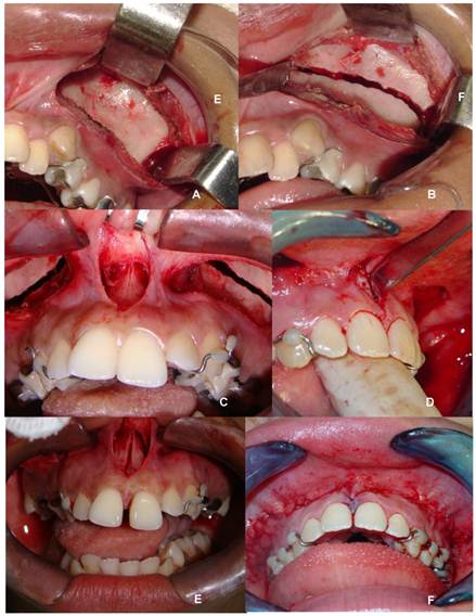 (A) - Incision in fundus of vestibular sulcus between canine and molar; (B) Osteotomy of lateral wall of maxilla from pyriform aperture to maxillary tuber; (C) Access to median palatine suture; (D) Positioning of osteotome for separation of median palatine suture; (E) Osteotomy of median palatine suture and diastema between central incisors (clinical sign of effective expansion); (F) Synthesis (ROCHA, 2008)