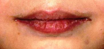 Our little patient showed an intraoral clinical condition very similar to father's, moreover, the patient was affected by a bilateral angular cheilitis. (Fig.3,4)