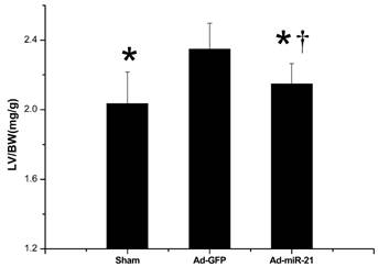 As shown in Fig.2, at 1 week after I/R, Ad-miR-21 significantly decreased the ratio LV/BW compared with the Ad-GFP group.