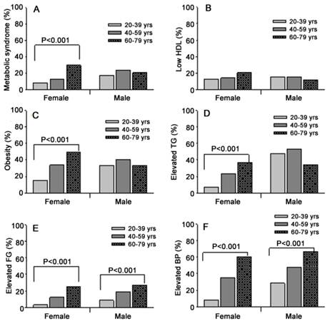MetS was diagnosed in 19.4% of the participants (14.0% in women and 22.1% in men, P<0.001). Except for HDL-C, the prevalence of other MetS components were significantly higher in men than women (P<0.001) as shown in Table 2. The prevalence of elevated BP and elevated fasting glucose increased with age irregardless of gender (P<0.001) and that of central obesity, elevated triglyceride, and MetS increased with age in women but not in men. In contrast, the prevalence of low HDL-C was not linearly correlated with age (Figure 1).