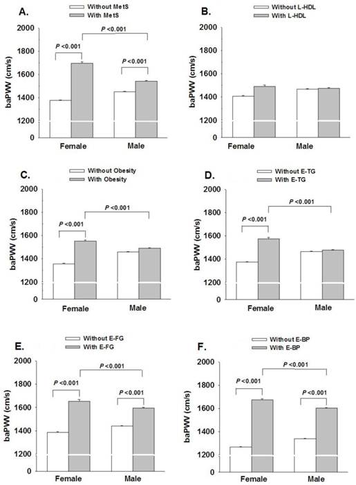 Gender dependent influence of MetS and MetS components on baPWV. L-HDL, low high-density lipoprotein cholesterol; Obesity, central obesity; E-TG, elevated triglyceride; E-FG, elevated fasting glucose; E-BP, elevated blood pressure.