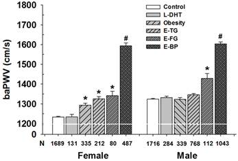 Influence of each MetS component on baPWV in different gender groups. L-HDL, low high-density lipoprotein cholesterol; Obesity, central obesity; E-TG, elevated triglycerides; E-FG, elevated fasting glucose; E-BP, elevated blood pressure. Control: subjects without metabolic disorders. Note: there was not difference between L-HDL group and control in men and women; The baPWV in subjects with obesity, E-TG or E-FG in women was comparable; L-HDL, Obesity and E-TG groups in women were not statistically significant each other. * P<0.001 vs. control; # P < 0.001 vs. E-FG group.