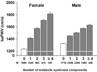 Figure 4 shows the mean baPWV according to the number of MetS components after adjustment for age. The mean baPWV in women with 0, 1, 2, 3 and ≥4 components of MetS was 1,233, 1,413, 1,574, 1707 and 1,814 cm/s, respectively (P<0.001), and that in men was 1,324, 1,450, 1,502, 1,574, and 1,628 cm/s (P<0.001).