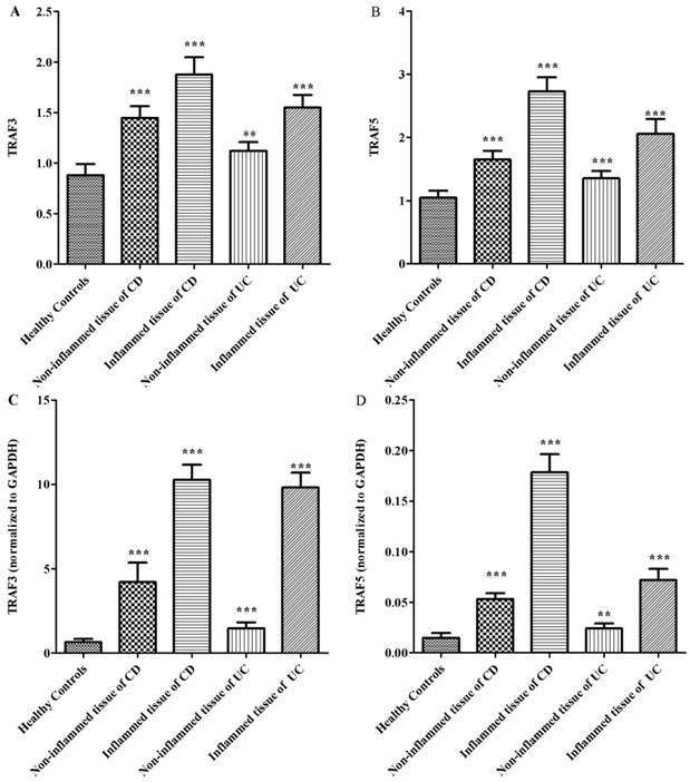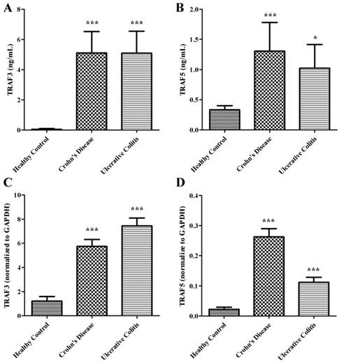 Methods: Plasma levels of TRAF3 and TRAF5 proteins were detected by Enzyme-linked Immunosorbent Assay (ELISA). Colonic expression of TRAF3 and TRAF5 proteins was detected by western blot analysis. Quantitative Real-time PCR (qRT-PCR) was applied for gene expression. Inflamed intestinal mucosa and non-inflamed intestinal mucosa in patients with inflammatory bowel disease and normal mucosa was analyzed from healthy controls.