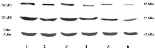 Tumor necrosis factor receptor (TNFR)-associated factors (TRAFs) are emerging as essential components of signaling pathways in adaptive and innate immunity [1]. A wide range of signal pathways are mediated by TRAFs involving activation of nuclear factor κB (NF-κB), mitogen-activated protein kinase (MAPK) or Toll-like receptors (TLRs) cascades [2, 3]. In recent years, there has been great interest in the roles of TRAF3 and TRAF5 play in cells of the immune system [4]. TRAF3 and TRAF5 share a common ancestral gene and are therefore homologous [5]. It is shown that TRAF5 plays an important role in B cell function, which requires TRAF3 to associate with endogenous LMP1 in B cells [6]. Although TRAF3 and TRAF5 are all involved in NF-κB activation, it seems that TRAF5 participates in the regulation of canonical and non-canonical NF-κB pathways [7], whereas TRAF3 is mainly involved in the control of non-canonical NF-κB signaling and has not been reported to contribute to the canonical pathway. Thus, additional roles for TRAF3 and TRAF5 associations are to be forthcoming.