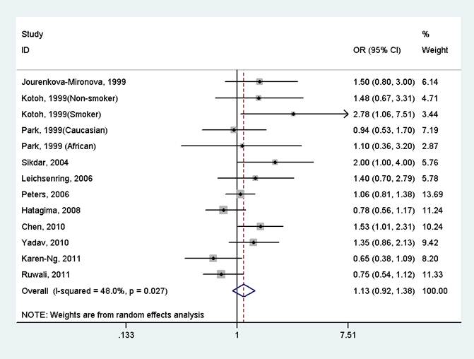 | Park,1999 (Caucasian) [10] | USA | Caucasian | 104 | 175 | 0.94 | 0.53-1.70 | Hospital-based | 3, 5 | Yes |