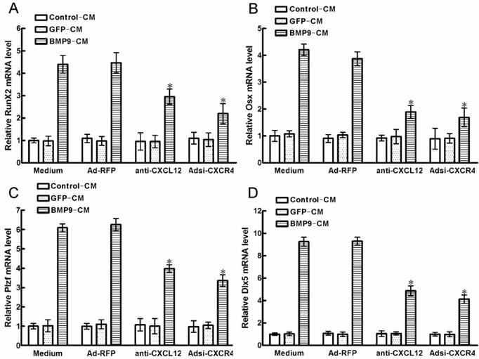 Blocking the CXCL12/CXCR4 signal axis inhibited BMP9-induced expressions of transcription factors. The cells were stimulated with Ad-CXCL12, anti-CXCL12 neutralizing antibody at 100μg/ml and Adsi-CXCR4 for 6h prior to the stimulation of BMP-CM or GFP-CM, as controls, maintained in culture medium only or stimulated with Ad-RFP. 1day later, the cells were collected for total RNA isolation. Each assay condition was carried out in triplicate. Data were shown as means ± SD of triplicate experiments. *, p<0.01 versus the Medium/BMP9-CM group.