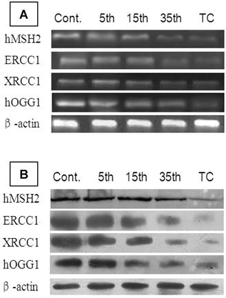 Total protein was isolated, electrophoresed on NuPAGE® 4%-12% Bis-Tris gel, and transferred to nitrocellulose membranes according to the manufacturer's instructions (Invitrogen, CA, USA). Immunoblotting was performed using mouse antibodies against human hMSH2, ERCC1, XRCC1, and hOGG1 (Abcam, Cambridge, MA, USA) and horseradish peroxidase-conjugated anti-mouse secondary antibody (Amersham Biosciences, Piscataway, NJ, USA) according to the kit's instructions.
