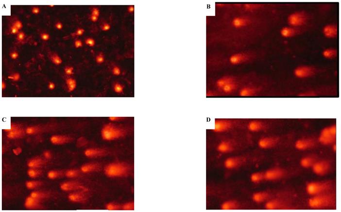 DNA damage to 16HBE cells treated with cadmium. (A) DNA damage to untransformed 16HBE cells with the comet assay; (B) DNA damage of 15th passage-transformed cells by comet assay; (C) DNA damage of 35th passage-transformed cells by comet assay; and (D) DNA damage of tumorigenic cells by comet assay.