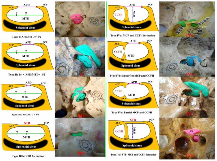 LBW: Lateral bone window of sella turcica; APD: Distance between anterior clinoid process and posterior clinoid process; MTD: Maximum traverse diameter; MLD: Maximum longitudinal diameter; STB: Sella turcica bridge; MCP: Middle clinoid process; LBH: Height of lateral bone of pituitary fossa; STD: Depth of sella turcica; CCFH: Carotico-clinoid foramen of Henle