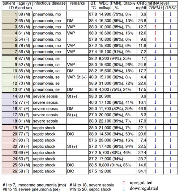 Objective: In the acute stage of infectious diseases such as pneumonia and sepsis, sequelae hypercytokinemia and cytokine storm are often observed simultaneously. During bacterial infections, activated polymorphonuclear leukocytes (PMNs) cause inflammation and organ dysfunction in severely ill patients. Gene expression of the triggering receptor on myeloid cells (TREM)-1 and G-coupled-protein receptor kinase (GRK)-2 in PMNs isolated from patients was analysed to identify genes correlated with the severity of pathophysiological conditions.