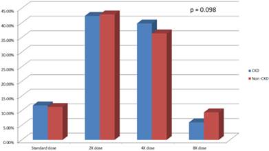 Overall 2168 (70.5%) patients had lipid-lowering agent treatment. Among the 818 CKD subjects 581 (71.0%) patients had lipid-lowering agent treatment (Table 3). CKD and non-CKD subjects received equivalent potency statin treatment at baseline (p = 0.098) (Figure 1).