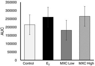 Area Under Curve by Treatment. VEGFR-2-Luc-mediated gene expression from dermal wounds expressed as area under the curve (AUC) to determine if an overall treatment effect was present. Control (safflower oil), E2; estradiol 17β (50µg/kg/d), MXC Low; methoxychlor low dose (30 mg/kg/d), and MXC High; methoxychlor high dose (150 mg/kg/d). There was no significant differences (P>0.05) in AUC between treatment groups.