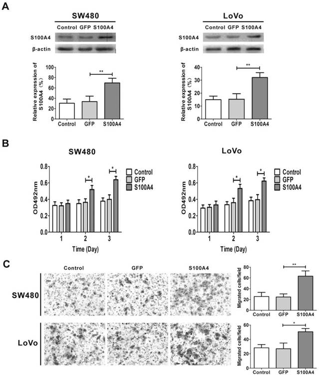 To explore the effects of S100A4 on viability and migration in CRC cells, we first infected two CRC cell lines SW480 and LoVo with Ad-S100A4 for S100A4 overexpression (Fig. 2A). While compared with the Ad-GFP group, S100A4 overexpression strongly increased the viability of SW480 and LoVo cells at 48 h and 72 h (Fig. 2B). Twenty-four hour after viral infection, the numbers of migrated SW480 or LoVo cells in S100A4 overexpression groups were much more than that in the GFP groups (Fig. 2C).