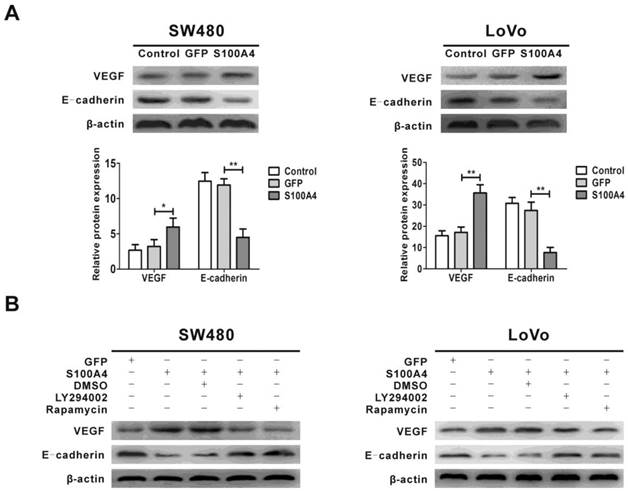 Previous studies showed that the expression of VEGF and E-cadherin was regulated by the PI3K/Akt/mTOR signaling pathway, and VEGF and E-cadherin are involved in viability and migration of various tumor cells [44, 45, 47]. We next examined the effect of S100A4 on the expression of VEGF and E-cadherin. The results showed that S100A4 overexpression obviously increased VEGF expression and decreased E-cadherin expression in SW480 and LoVo cells (Fig. 5A), which were abolished by treatment with either LY294002 or rapamycin (Fig. 5B).
