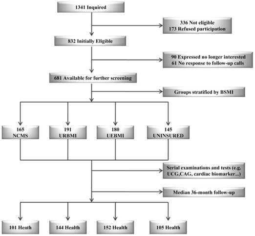 Patient flow and main outcomes. Abbreviations: BSMI, basic social medical insurance; NCMS, new rural cooperative medical scheme; URBMI, urban resident basic medical insurance scheme; UEBMI, urban employee basic medical insurance scheme; UCG: ultrasonic cardiogram; CAG: coronary angiography.