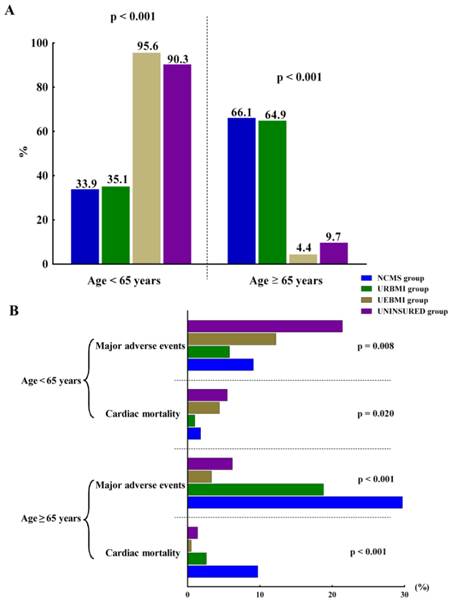 Incidence of major adverse events and cardiac mortality of the enrolled patients with different ages. (A) The proportion of patients with an age <65 years or ≥65 years in four groups. (B) Incidence of major adverse events and cardiac mortality of the enrolled patients with different ages. The proportion of patients ≥65 years with a major adverse event was 29.7% and 18.8% in NCMS group and URBMI group, respectively. However, this proportion was significantly lower in UEBMI and UNINSURED groups (3.3% and 6.2%, respectively). The majority of patients with a major adverse event in UEBMI and UNINSURED groups were <65 years. Abbreviations: NCMS, new rural cooperative medical scheme; URBMI, urban resident basic medical insurance scheme; UEBMI, urban employee basic medical insurance scheme.