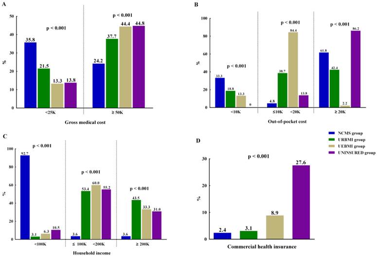 The out-of-pocket cost showed significantly difference in the study groups. The UNINSURED patients should pay all gross medical cost and thus were sorted into ≥20K category mostly (125; 86.2%). As to BSMI participants, majority of UEBMI patients' out-of-pocket cost (n; %) was in the 10K≤ <20K category (152; 84.4%). Although supported by BSMI, most patients in NCMS group still paid ≥20K after insurance reimbursement (102; 61.8%) (Figure 4). The household income of NCMS patients (n; %) were mainly in <100K category (153; 92.7%), which differs significantly from the other groups (p<0.001) (Figure 4). Commercial health insurance covered significantly more patients in UNINSURED group (40; 27.6%, p<0.001) compared with other groups (Figure 4).