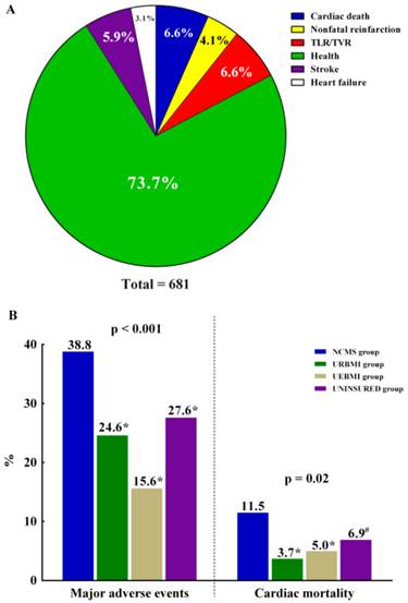 The clinical outcomes of the enrolled patients. (A) The proportion of different major adverse events of the enrolled patients. (B) Cardiac mortality and incidence of major adverse events in four groups. The incidence of major adverse events was significantly higher in NCMS patients (64; 38.8%) compared with the other groups: URBMI (47; 24.6%); UEBMI (28; 15.6%); UNISURED (40; 27.6%). Similarly, cardiac mortality was also higher in NCMS group (19; 11.5%) compared with the other groups: URBMI (7; 3.7%); UEBMI (9; 5.0%); UNISURED (10; 6.9%). * p<0.001 versus NCMS group, # p<0.05 versus NCMS group. Abbreviations: TLR, target lesion revascularization; TVR, target vessel revascularization; NCMS, new rural cooperative medical scheme; URBMI, urban resident basic medical insurance scheme; UEBMI, urban employee basic medical insurance scheme.