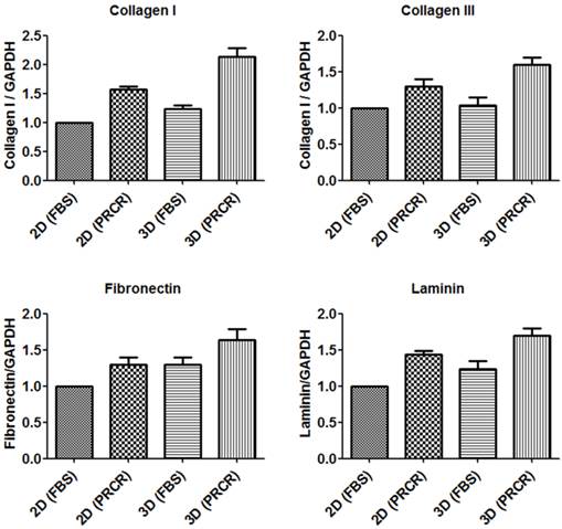 Study the expression level of extracellular gene markers collagen I, collagen III, fibronectin and laminin using Real time- PCR. Skin fibroblast were plated at 106/ T75 flask (2D culture) or scaffold (3D culture) and maintained in FBS free DMEM medium supplemented with 10% PRCR (Treatment group) or 10% FBS (Control group). Cells were harvested after 72 h and total RNA was extracted and proceeded for RT-PCR (the amount of 1 µg of pure RNA was used for gene expression analysis). PRCR treatment increased the expression level of collagen I and collagen III compared with control in 2D and 3D cultures. The results also showed the effect of the environment on the expression level of collagen I (P<0.05, One-way ANOVA) and collagen III (P>0.05, One-way ANOVA) in 2D compared to 3D culture. Significant increase in the expression level of fibronectin and laminin in the PRCR-treated cells compared with control in the 2D (P<0.05, One-way ANOVA) and 3D environment (P<0.01, One-way ANOVA).