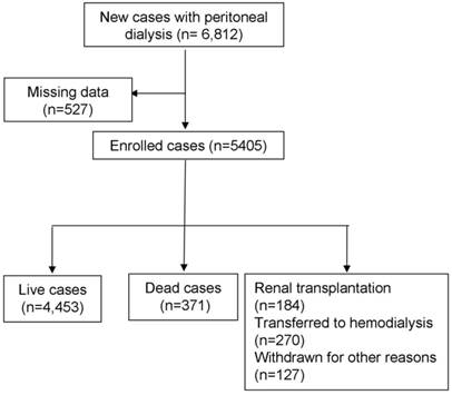 A total of 5,405 new cases of PD the China Peritoneal Dialysis Registry were recruited for this study in 2012 from. All these patients had complete baseline data and were followed for one year. Inclusion criteria were age ≥ 18 years, either gender, continuous ambulatory PD (CAPD) ≥ 3 months, explicit time of PD catheter implantation stated, baseline laboratory tests completed within the three months before PD placement, clear outcome time and circumstances, and followed for one year or had end events within one year. Exclusion criteria were non-CAPD patients, cancer, severe complications in the heart, brain or other organs, missing basic information, and incomplete baseline data; . A total of 5,405 patients who met these criteria were enrolled in the study group.