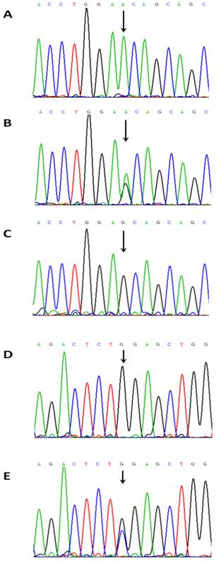 NKX2-5 sequence variations. (A) A NKX2-5 homozygous sequence variant c.65A/A. (B) A NKX2-5 heterozygous sequence variant c.65A>G (E21E). (C) A NKX2-5 homozygous sequence variant c.65G/G. (D) A NKX2-5 homozygous sequence variant c.606G/G. (E) A NKX2-5 homozygous sequence variant c.606 G > C (L202L).