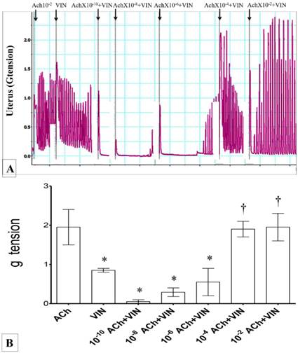 (A) & (B): Combined effect of Ach and vinclozolin on uterine contraction. Highest force of contraction was noted following exposure to 10-2M Ach. Exposure to vinclozolin resulted in marked decrease in the uterine contractile force. Force of uterine contraction increased with increasing doses of Ach. * p<0.05 as compared to Ach. † p<0.05 compared to vinclozolin n=6 animals per group Ach: acetylcholine, Vin: vinclozolin.