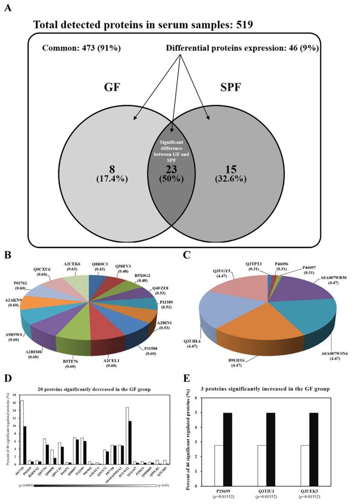 Venn diagrams comparing the common, only detected, or overlap in significant regulated proteins for serum samples from SPF and GF mice. (A) There was a 91% common and a 9% significant regulated proteins between two groups. When the 91% un-changed proteins were removed and the other significant regulated proteins were normalized to 100%, there was a 17.4% unique proteins in GF mice, a 32.6% unique proteins in SPF mice, and an 50% overlap in significant regulated proteins between SPF mice and GF mice. (B) The percent distributions for the 8 proteins were only detected in GF mice. (C) The percent distributions for the 15 proteins were only detected in SPF mice. (D) The percent distributions for the 3 proteins were significantly increased in GF mice compared to SPF mice. (E) The percent distributions for the 20 proteins were significantly decreased in GF mice compared to SPF mice.