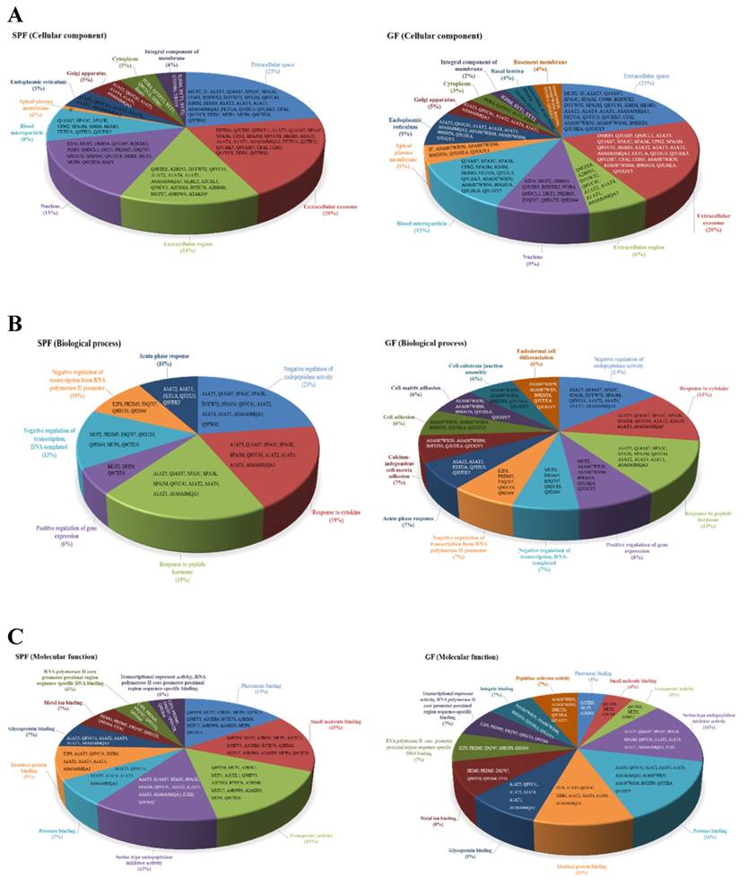 Classification of the differentially expressed proteins in liver tissues were identified from SPF and GF mice. (A) Pie charts representing the distribution of the differential proteins in SPF (left panel) and GF (right panel) mice according to their cellular component. (B) Pie charts representing the distribution of the differential proteins in SPF (left panel) and GF (right panel) mice according to their biological process. (C) Pie charts representing the distribution of the differential proteins in SPF (left panel) and GF (right panel) mice according to their molecular function.
