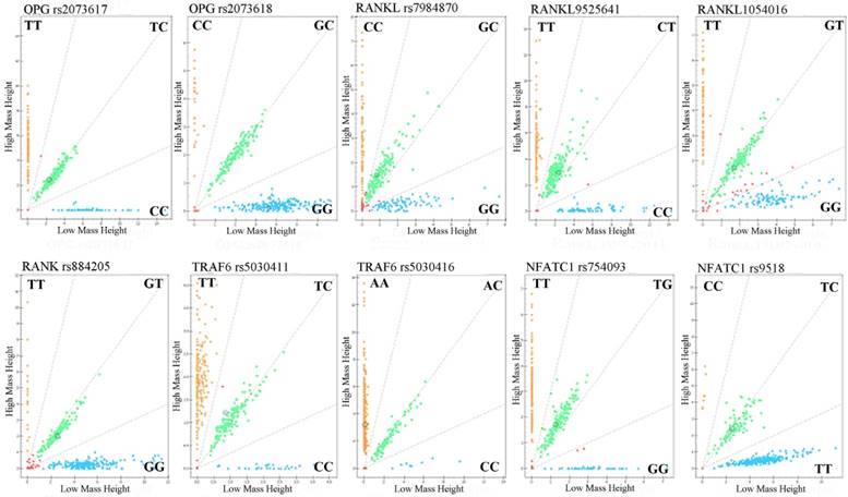 Genotyping of 10SNPs in the RANKL, RANK, OPG, TRAF6, and NFATC1 genes by MALDI-ToF-MS. The green plots represents heterozygous genotypes, yellow and blue plots represent major homozygous or minor homozygous genotypes in the call cluster plot of each SNP, respectively. MALDI-ToF-MS: matrix-assisted laser desorption/ionization time-of-flight mass spectrometry.