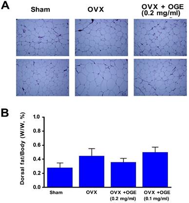 OGE supplementation attenuated weight gain in OVX rats. Investigation on effects of supplementation on adipocyte properties revealed that adipocytes in perigonadal adipose tissues of OVX rats were clearly enlarged compared with those from sham-operated control rats (Figure 2A). High OGE supplementation (0.2 mg/ml) reduced enlarged adipocyte size in response to ovariectomy. Changes in dorsal fat mass were also analyzed. Ratio of dorsal fat mass/body weight was insignificantly changed among four experimental groups, though dorsal fat mass in OVX group was higher than that in sham group (Figure 2B).