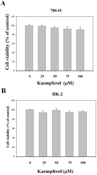 Various concentrations of kaempferol (0, 25, 50, 75, and 100 μM) did not exert significant cytotoxic effects on the RCC 786-O cells. Data from microculture tetrazolium assay (Figure 1A) reveal that the cell numbers of RCC 786-O cells in the presence of 25, 50, 75, and 100 μM kaempferol were not significantly different from those of the control group (0 μM). Using the same procedures, we found that this compound did not exert any significant cytotoxicity on nonmalignant human proximal tubule epithelial HK-2 cells (Figure 1B).