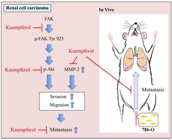 First, kaempferol inhibits the migration and invasion of RCC 786-O cells. Second, MMP-2 protein expression is suppressed by kaempferol. Third, kaempferol downregulates the phosphorylation levels of Akt and FAK. Finally, the animal model of SCID mice also manifests that kaempferol can inhibit the lung metastasis of the RCC 786-O cell.