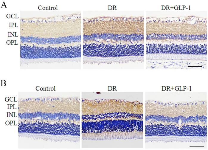 The changes in GLP-1R expression indicated by immunohistochemistry analysis were consistent with those shown by western blot analysis. GLP-1R was expressed in the inner layers of the retina, primarily in the INL and ganglion cells. As shown in Fig.5B, GLP-1R expression was significantly decreased in retinal cells of diabetic rats compare with those of healthy rats, while GLP-1 treatment notably restored the expression of GLP-1R.