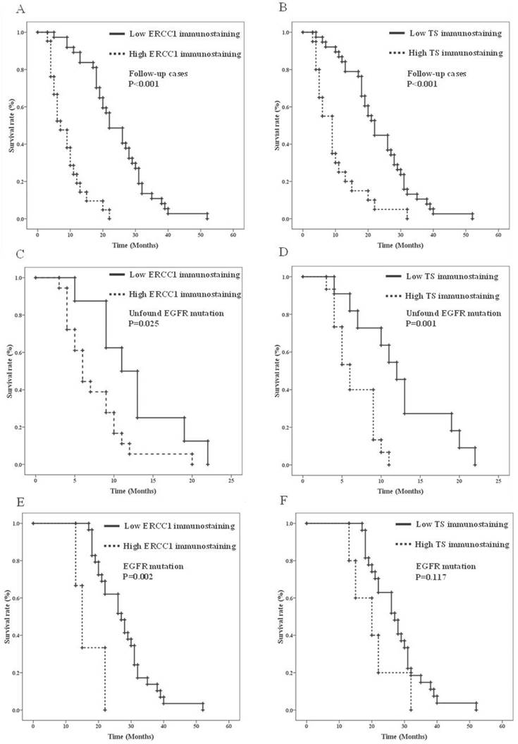 Overall survival analysis of ERCC1 and TS immunostainings in AC-NSCLC stratified by EGFR mutation status. A. Kaplan-Meier survival curves of ERCC1 immunostaining in AC-NSCLC. B. Kaplan-Meier survival curves of TS immunostaining in AC-NSCLC. C. Kaplan-Meier survival curves of ERCC1 immunostaining in unfound EGFR mutation AC-NSCLS. D. Kaplan-Meier survival curves of TS immunostaining in unfound EGFR mutation AC-NSCLS. E. Kaplan-Meier survival curves of ERCC1 immunostaining in positive EGFR mutation AC-NSCLS. F. Kaplan-Meier survival curves of TS immunostaining in positive EGFR mutation AC-NSCLS.