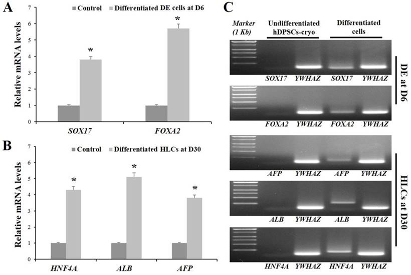 RT-qPCR data for in vitro differentiated cells of definitive endoderm (DE) at D6 and hepatocyte-like cells (HLCs) at D30. (A) Relative mRNA levels for DE- and hepatocyte-markers were calculated with the 2-ΔΔCt method using YWHAZ for normalization and are expressed as the fold-change relative to the control (undifferentiated hDPSCs-cryo). The differentiated DE cells at D6 and HLCs at D30 showed 4-6-fold higher mRNA levels for their specific markers (SOX17 and FOXA2 for DE; HNF4A1, ALB3 and AFP3 for hepatocyte) compared than those of control. Data represent the mean ± SD of four independent experiments. Significantly different from control; *, p < 0.05 (B) Representative images of RT-PCR products of hDPSCs-cryo group to show product size of (A). Abbreviations: SOX17, sex determining region Y-box 17; FOXA2, forkhead box protein A2 (hepatocyte nuclear factor 3-beta); AFP, alpha-Fetoprotein; ALB, human albumin; HNF4A, hepatonuclear factor 4 alpha; Tyrosine 3-monooxygenease/tryptophan 5-monooxygenease activation protein, zeta polypeptide.