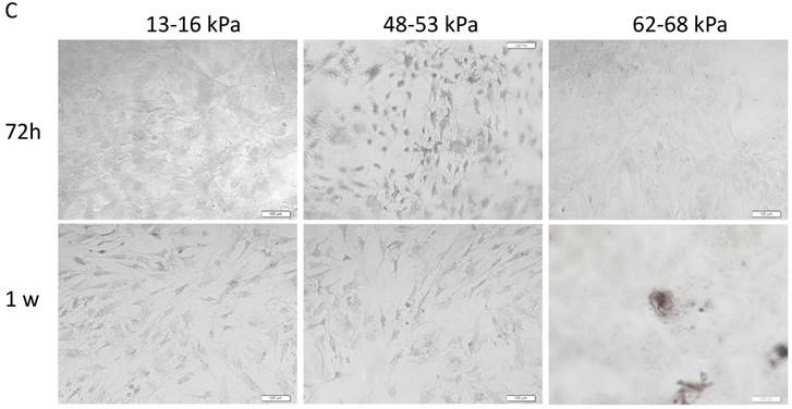To determine the influence of matrix stiffness on the differentiation of BMMSCs, we cultured the BMMSCs in osteogenic medium on polyacrylamide substrates with varying stiffnesses for 4h, 24h, 72h and 1 week. We then used qPCR to determine the expression of osteogenic regulator RUNX2, early osteogenic markers COL1A1, Osteopontin, ALP and late stage markers Osteocalcin in the cells. It showed that the expressions of RUNX2 were highest at 4h but significantly elevated on the gel with the stiffness of 62-68 kPa at 1 week. And COL1A1 were significantly increased on gel with 48-53 kPa at 72h while Osteocalcin were highest on the 62-68 kPa at 1 week; ALP expression was highest on the 13-16 kPa at 4h but was significantly elevated on the 62-68 kPa during 72h to 1 week. Osteocalcin expression was highest on the 13-16 kPa at 4h and 24h, while it was highest on the 48-53 kPa at 1 week (Fig. 5A). RUNX2 expression was lower from 4h to 1 week on the 13-16 kPa while higher from 4h to 1 week. COL1A1 expression was higher from 4h to 72h on the 13-16 kPa while higher from 4h to 1 week on the 48-53 kPa and 62-68 kPa. Osteopontin expression was lower from 4h to 1 week on the 13-16 kPa and from 4h to 24h on the 48-53 kPa, while was higher at the 62-68 kPa during 4h to 72h. ALP expression was higher from 4h to 1 week on the 13-16 kPa and it was higher from 4h to 72h but lower at 1 week on the 48-53 kPa. However, ALP expression was higher at 1 week than 4h on the 62-68 kPa. Osteocalcin expression was lower from 4h to 1 week. There was no significant difference between other groups (Fig. 5B). After cultured on three groups for 72h and 1 week, we stained Alizarin red S to detect calcium deposits. It has shown that cells secrete calcium deposits on 62-68 kPa at 1 week, while negative expression on the other groups (Fig. 5C). Collectively, these results support that culture on 62-68 kPa induced MSCs differentiation into osteoblasts. These results showed cells on 62-68 kPa differentiated to osteoblast.