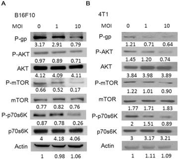 To gain insights into the role of P-gp on Salmonella infection, we used Western blotting analysis to study the correlation between P-gp and Salmonella infection. Fig. 2 shows that the protein levels of P-gp were decreased in Salmonella-treated tumor cells. Furthermore, the AKT /mTOR signaling pathway can promote P-gp protein synthesis through phosphorylation of p70s6K [17, 18]. In dose dependent manner, Salmonella significantly reduced the phosphorylation of AKT, mTOR, and p70s6K in B16F10 and 4T1 cells (Fig. 2). These results suggest that reduction of P-gp expression in tumor cells was associated with inhibition AKT/mTOR/p70s6K signaling pathway during Salmonella infection.