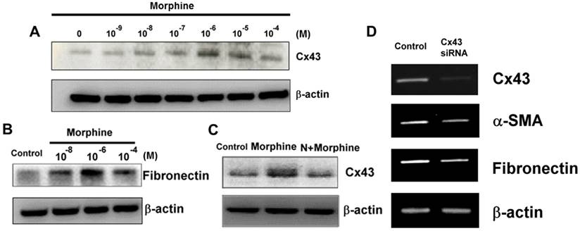 High-dose morphine stimulated α-SMA expression levels depending on Cx43 expression levels. Treatment of WS-1 cells with morphine increased the expression levels of (A) Cx43 and (B) fibronectin. (C) Morphine (10-4 μM)-induced Cx43 expression was reversed by naloxone (N, 10-4 μM). (D) Knockdown of Cx43 expression attenuated mRNA levels of Cx43, α-SMA and fibronectin in the WS-1 cells.