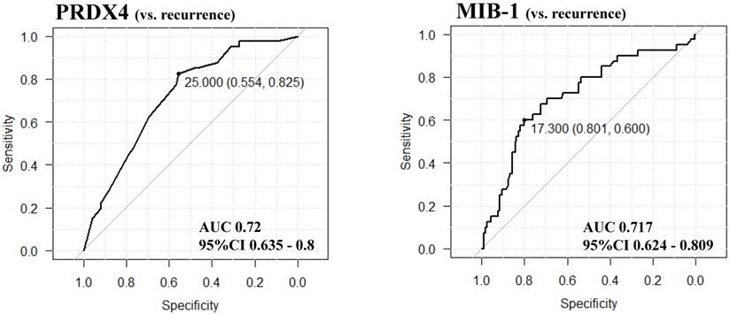 The results of the receiver operating characteristic (ROC) curve analyses for selecting and validating the immunohistochemical cut-off points for PRDX4 and MIB-1 expression. We selected the cut-off values of PRDX4 and MIB-1 using ROC and the area under the curve (AUC), as an effective measure of accuracy has been considered a meaningful interpretation. We selected 25 and 17.3, respectively, as the cut-off points for PRDX4 and MIB-1, since the AUC for recurrence was the highest among all clinicopathological variables.
