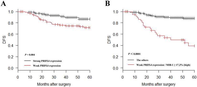 Kaplan-Meier curves of the disease-free survival (DFS) in patients with lung adenocarcinoma after surgery according to the PRDX4 expression. Weak PRDX4 expression alone as well as weak PRDX4/high MIB-1 is associated with a significantly shorter postsurgical DFS in stage I-LUAD patients.
