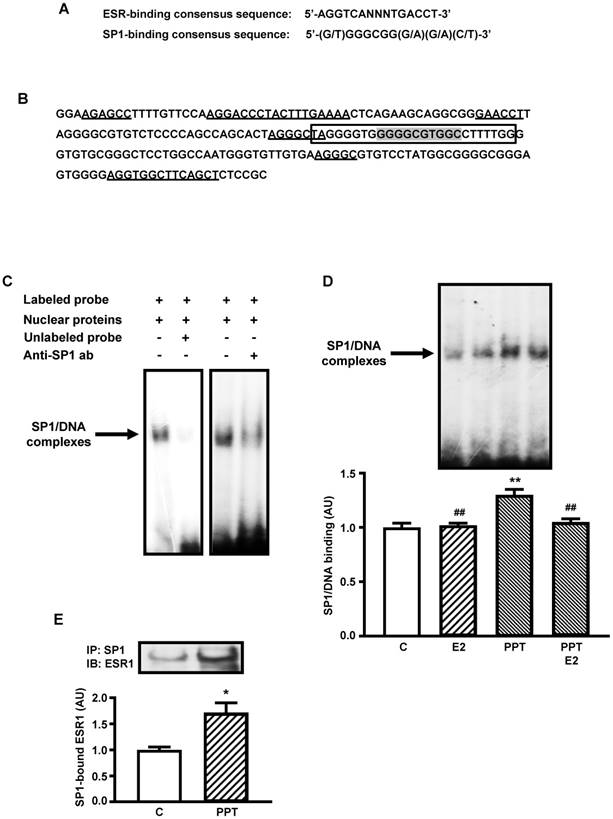 Finally, to confirm whether this PPT-induced increase in SP1 binding activity could be related to a molecular interaction between ESR1/SP1, SP1 protein was immunoprecipitated from nuclear protein extract, and the immunoprecipitated samples were subjected to ESR1 quantification by Western blotting. Figure 2E shows that PPT treatment significantly increased (72%; P=0.0388) the amount of ESR1 arrested by SP1 immunoprecipitation.