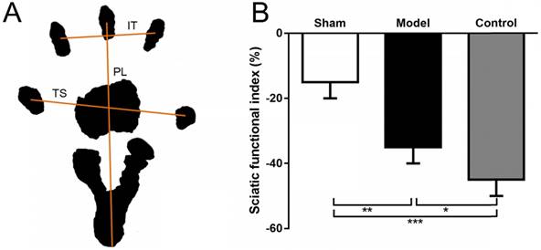 (A) Representation of the parameter in calculating the SFI after obtaining the animals' footprints. Print length (PL), distance from heel to toe. Toe spread (TS), distance from first to fifth toe. And intermediary toe spread (IT), distance from second to fourth toe. (B) SFI in sham group (sham surgery + saline) and model group (SNT + CoCl2) was better than that in control group (SNT + saline). SFI: sciatic functional index. * p < 0.05. ** p < 0.01.