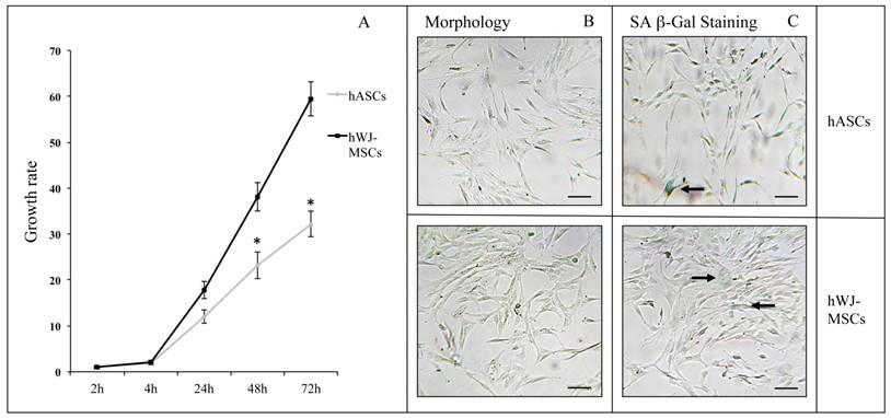 (A) Cell proliferation and senescence in hASCs and hWJ-MSCs: growth rate of hASCs (n=4) and hWJ-MSCs (n=4) expressed as mean ± standard error of the mean (SEM; *p<0.05). Typical hASC and hWJ-MSC morphology at 9th - and 8th culture passages respectively (B), and SA β-Gal staining in hASCs and hWJ-MSCs (C). Cells were analyzed under a light microscope and cell images were detected under bright field illumination with the Leica MC170 HD Imaging System at 200× magnification. Scale bars: 100 μm. Representative blue cells, as markers of senescence, are indicated by black arrows.