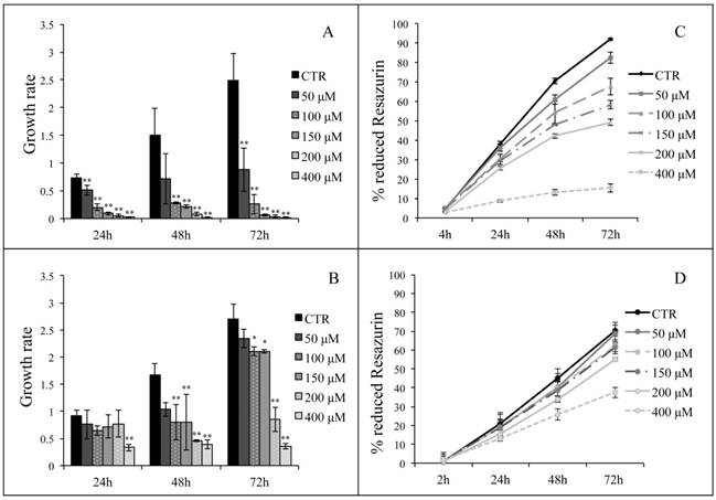 Panels A and B: hASCs (A) and hWJ-MSCs (B) cell counts, expressed as growth rates, calculated as the cell number at each time point divided by the cell number of seeded cells. Data are expressed as mean of growth rates ± SD (n=3, *p<0.05, **p<0.01). Panels C and D: percentage of reduction of Resazurin (as indicator of cell proliferation) after treatment of hASCs (C) and hWJ-MSCs (D) for 2 h with H2O2 (50, 100, 150, 200 or 400 μM). Analysis was conducted on a technical quadruplicate at 4, 24, 48, 72 h (C) or at 2, 24, 48, 72 h (D) from the end of the treatment and data are expressed as mean ± SD.
